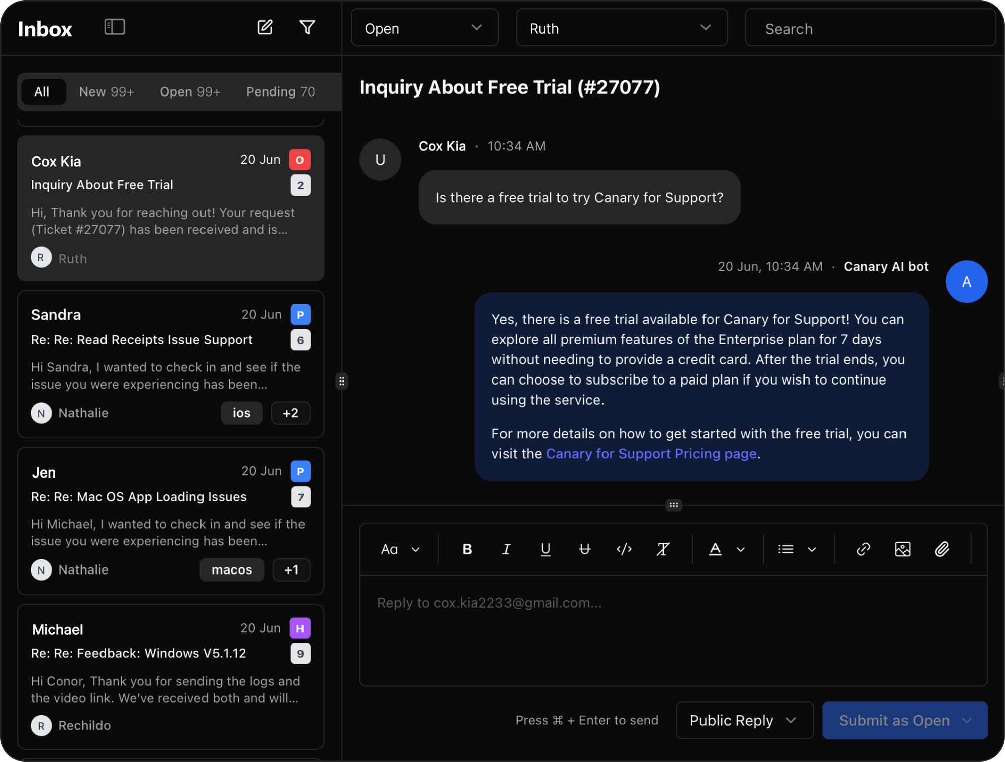 Much like Help Scout and Helpwise, Shared Inbox by Canary organizes all incoming emails into a single, unified inbox so your team never misses a customer query. It also includes AI-powered features to help you draft responses faster and analyze common issues across your inbox.