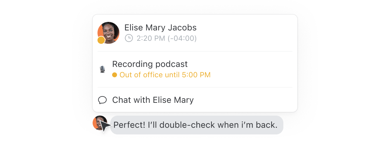 Hover your coworkers’ avatar to display their local time, status, and a shortcut to your chatroom together.