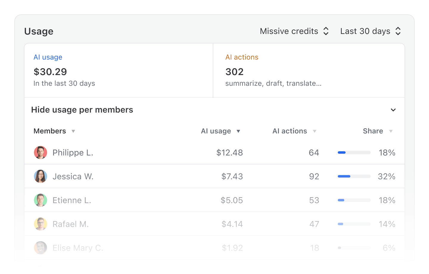 For AI features, you can now choose between using Missive AI credits or bring-your-own-key (BYOK). Missive AI Credits let you purchase credits directly from Missive and start using the assistant, prompts, and AI rules without setting up an external provider account. Credits are linked to your organization for usage monitoring and can be shared with your team. To celebrate, all paid organizations get $5 of free credit. Go on, test it out.