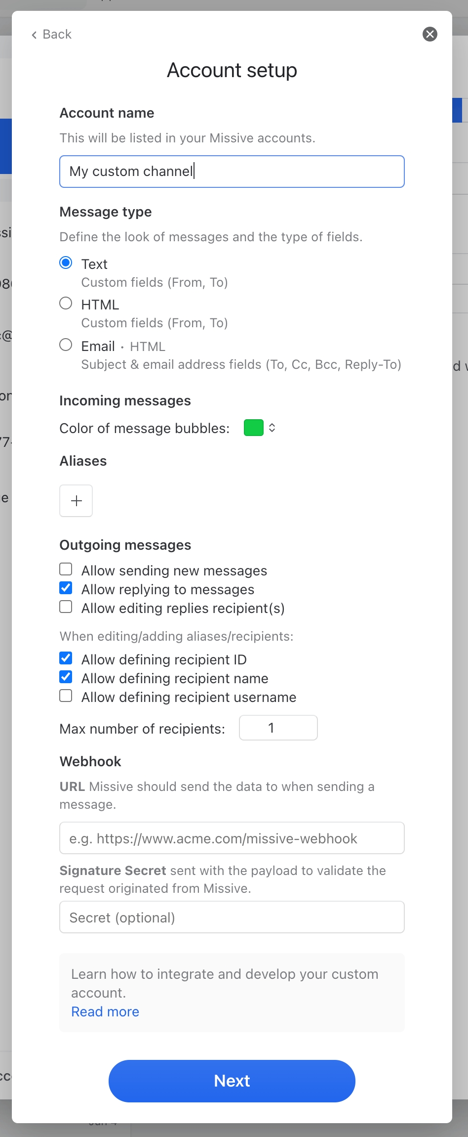 Custom channels allow you to integrate Missive with any communication channel or message source. You can create incoming messages and optionally reply to messages directly from Missive.