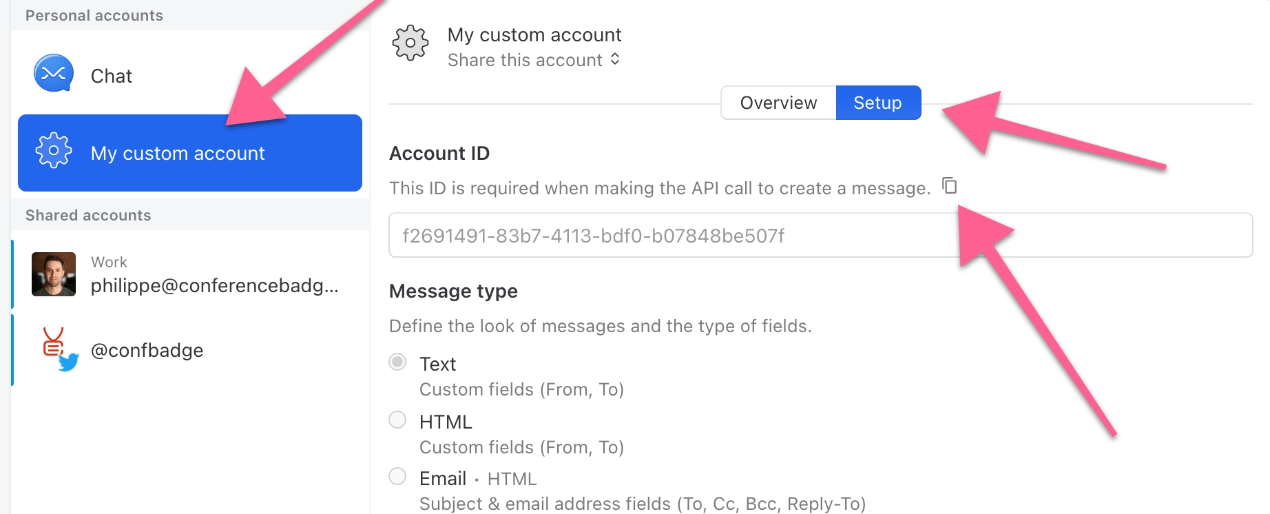 You must pass your channel ID when creating messages. You can find it under Account ID once your channel has been created.