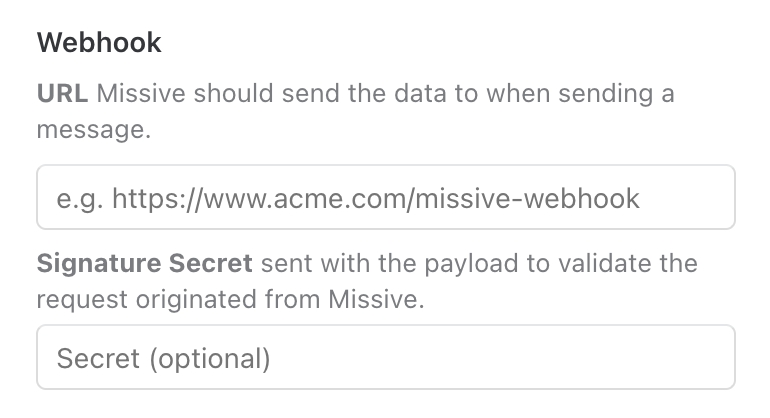 To send messages via the custom channel, you must define a webhook URL endpoint. Every time you send a message from Missive, the associated payload will be posted to this endpoint.