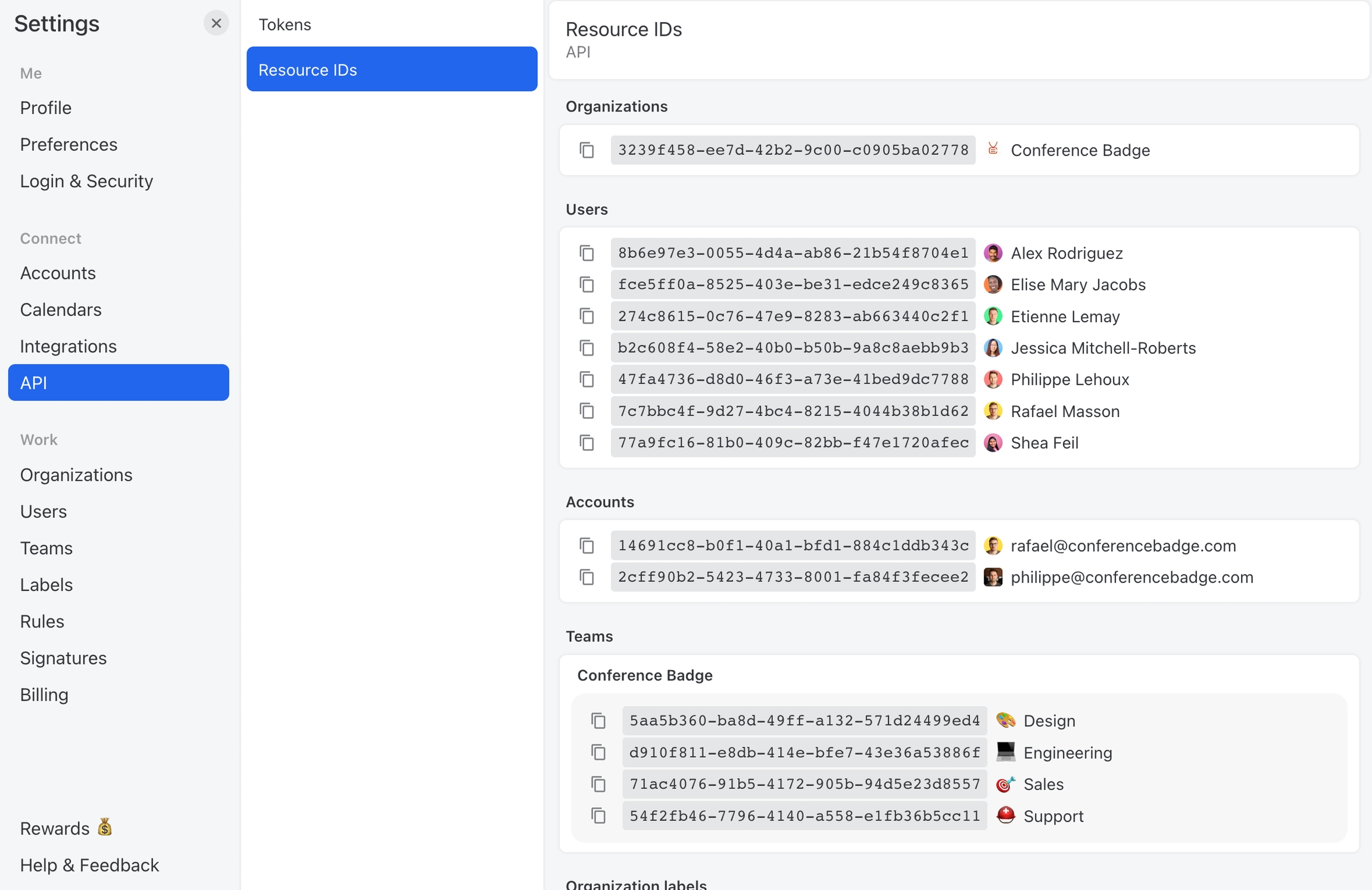 To interact with resources via the API, you will need those resource's ID. For instance, if you want to apply a label to a conversation when creating a post, you will need the label ID. You can get those resources IDs by opening the API settings and clicking on the Resource IDs tab.