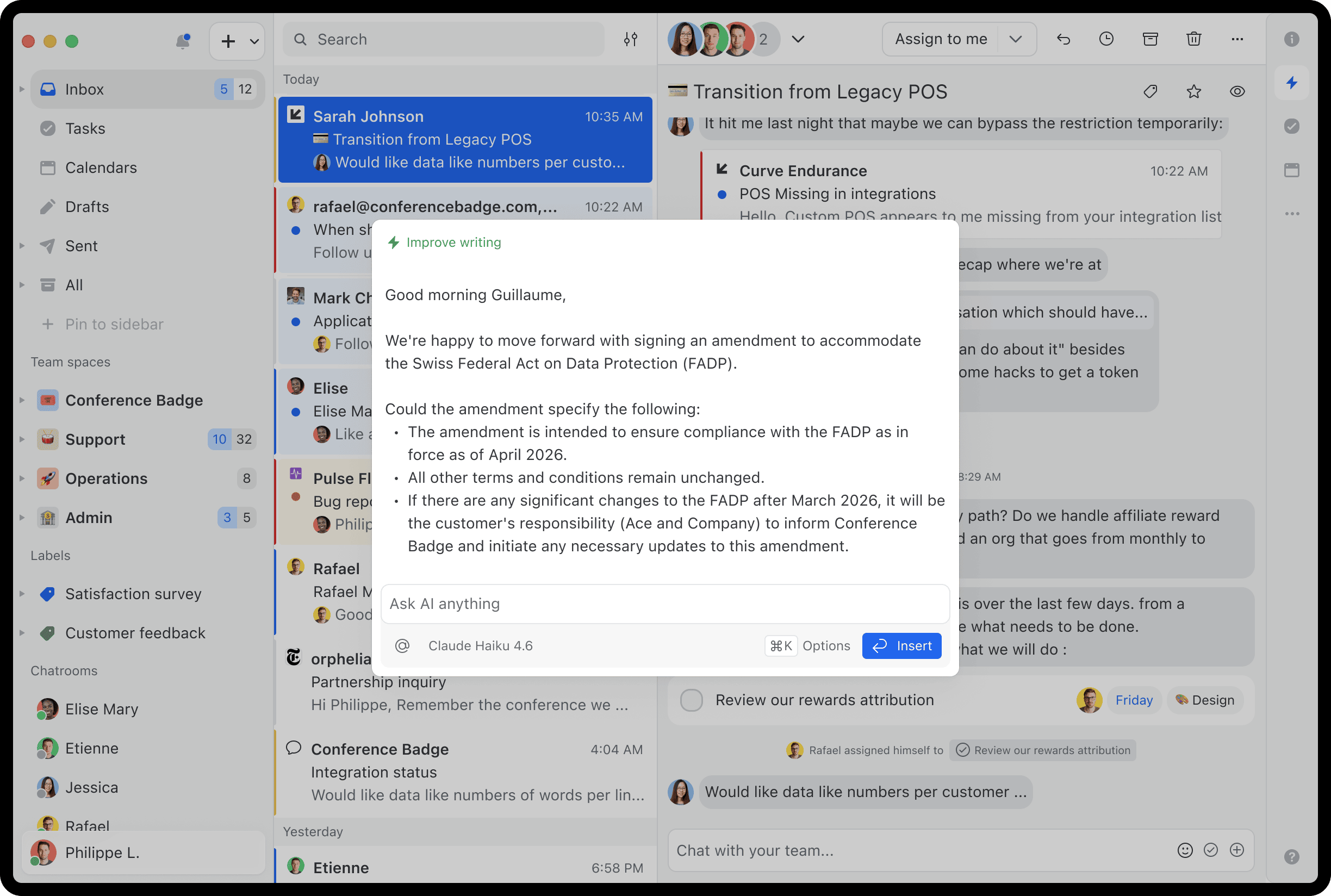 Missive's AI works inside your inbox — reading threads, checking calendars, and drafting replies with full context. Everything in one place.