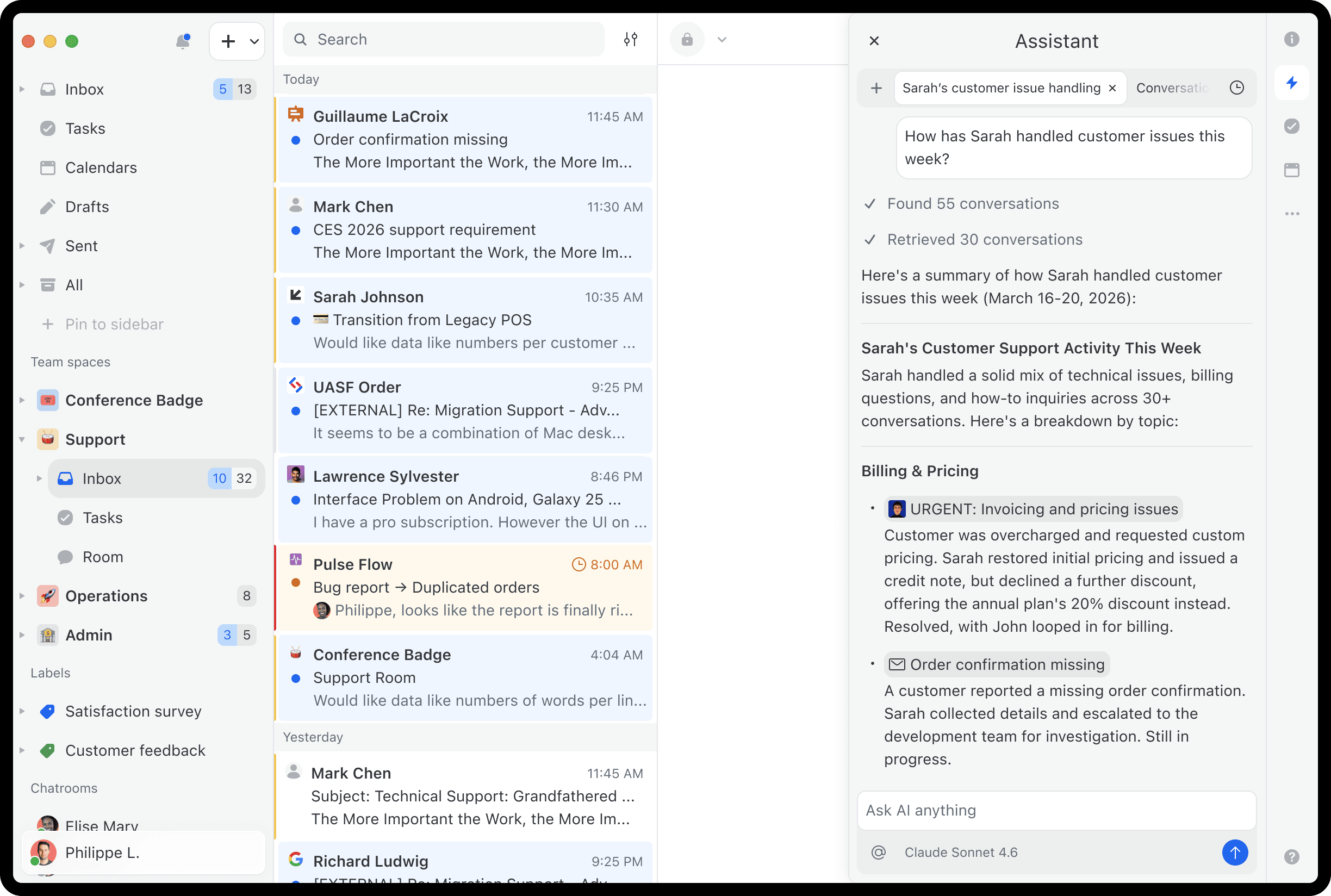 Ask "how has Sarah handled customer issues this week?" and get a summary in one question.