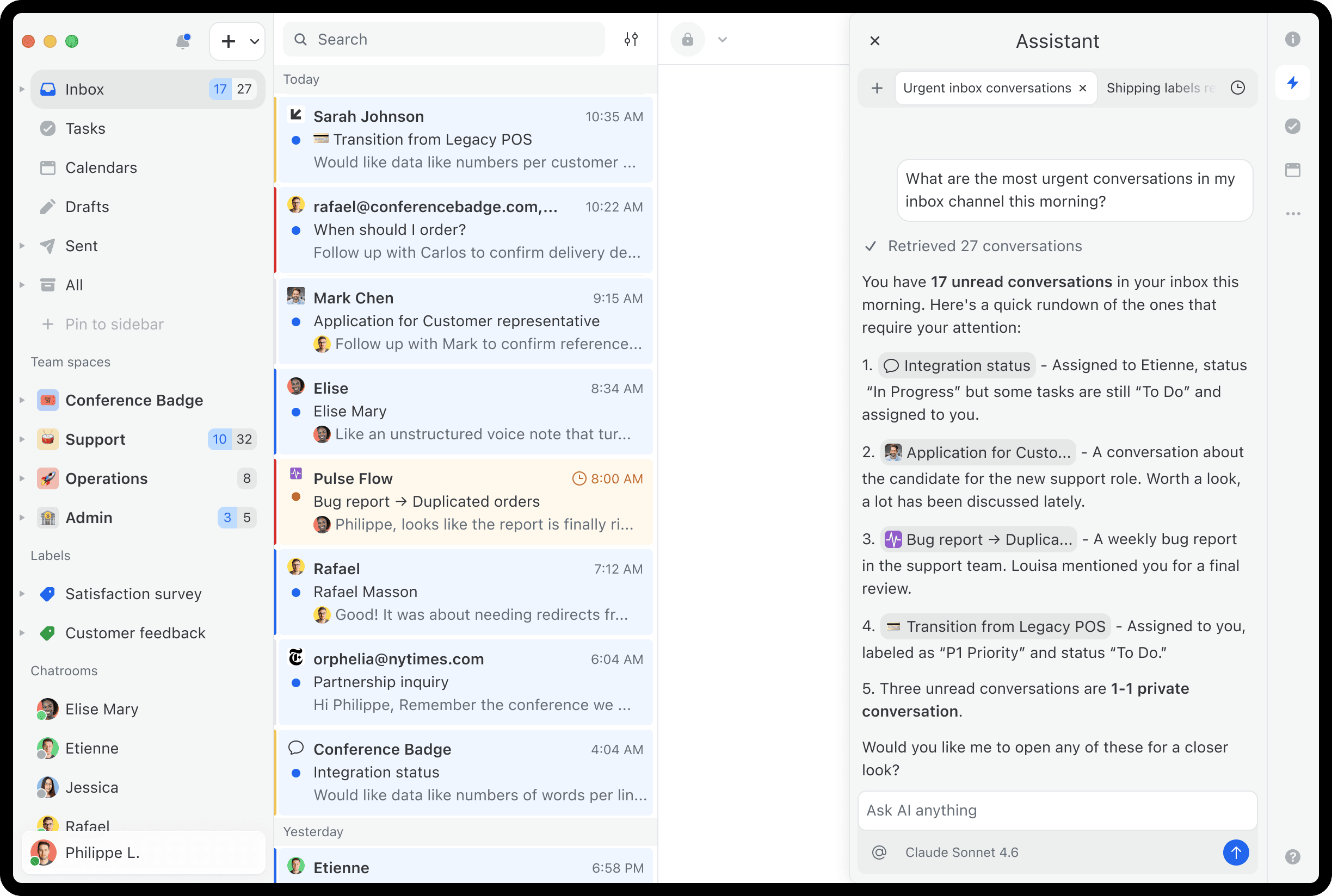 Ask the assistant to look up a customer's billing history in Stripe, create a Linear issue from a bug report email, or pull context from a Notion doc or your CRM/TMS, before replying. It all happens in the sidebar, in the same conversation.